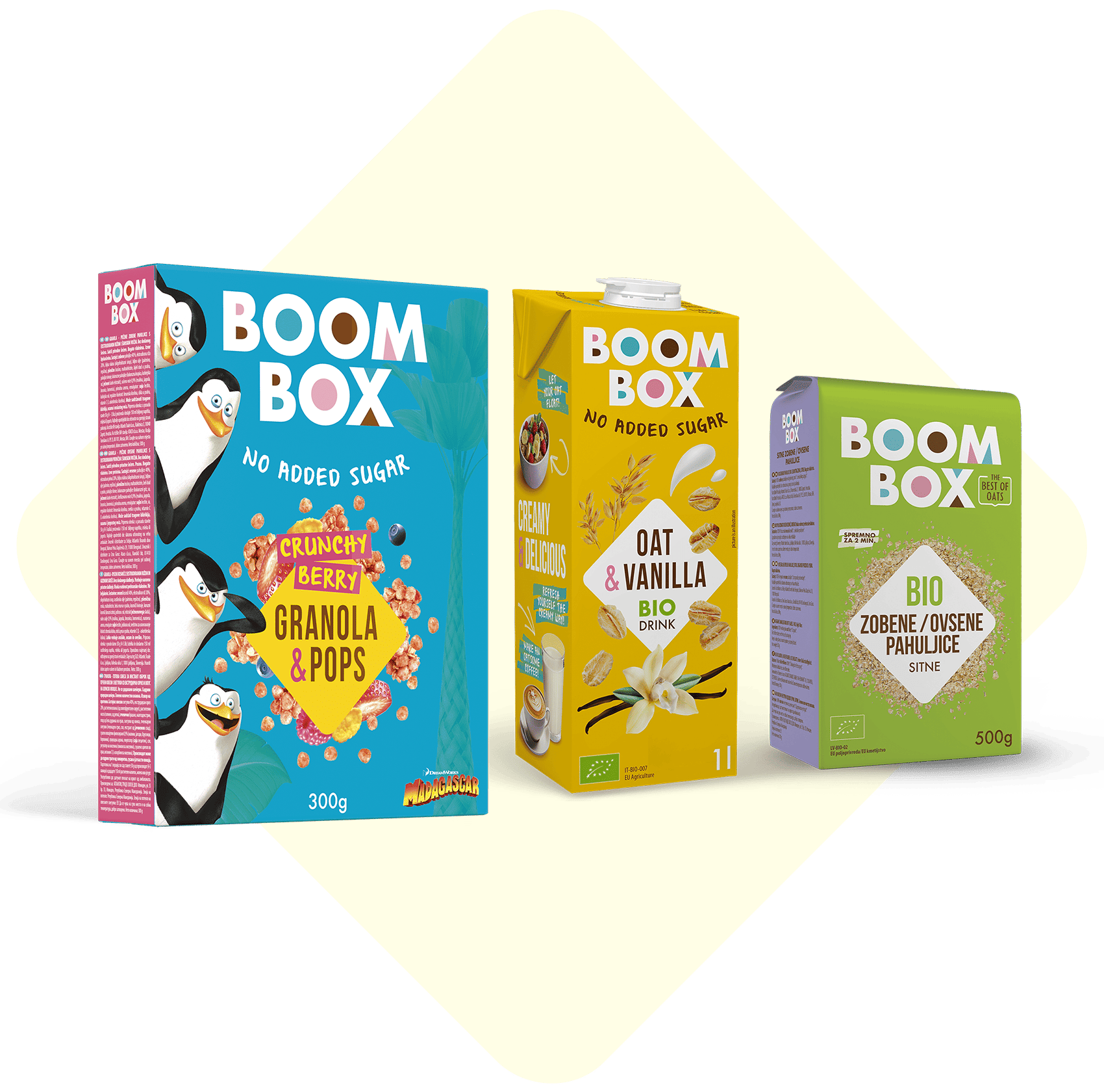 Izdelki Boom Box so na osnovi 100% rastlinskih sestavinah, brez dodanega sladkorja in umetnih arom, junak naše zgodbe pa je oves.
